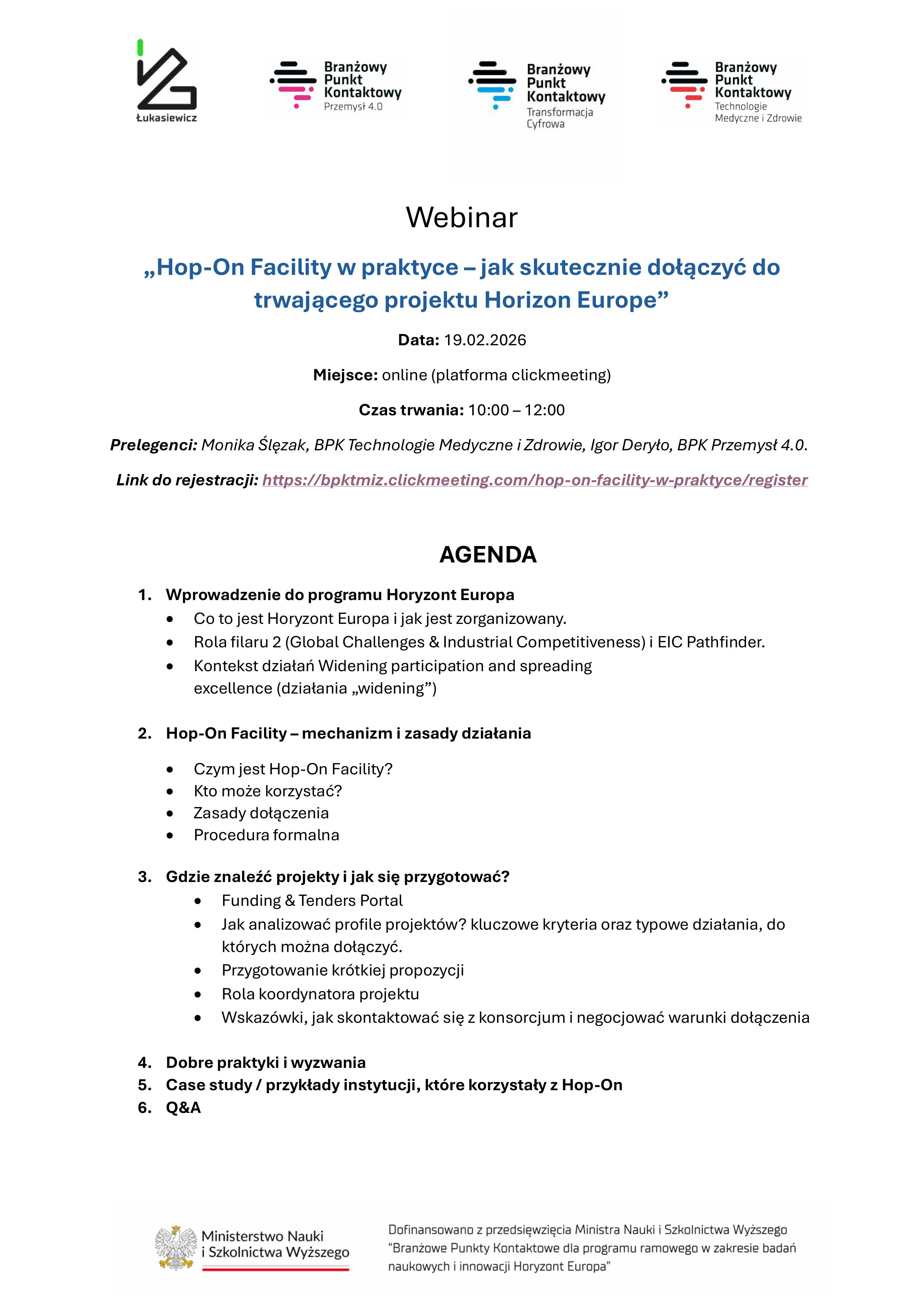 Zapraszamy na bezpłatne szkolenie online „Hop-On Facility w praktyce – jak dołączyć do trwającego projektu Horizon Europe”, które odbędzie się 19 lutego 2026 r. o godz. 10.00 na platformie ClickMeeting.